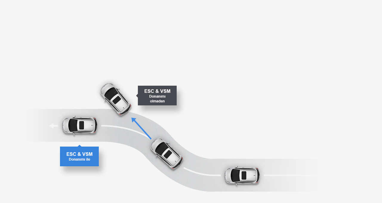 Elektronik Denge Kontrolü (ESC) ve Araç Stabilite Yönetim Programı (VSM) Her bir tekerin çekiş değerinden Veloster'in gövdesinin nasıl hareket ettiğine kadar her şeyi hesaba katan Araç Stabilite Yönetim Programı (VSM) sayesinde işler yolunda, geri kalan her şey ise standart Elektronik Denge Kontrolü (ESC) ile güvende. Bu özellikler vasıtasıyla Veloster'nız artık ani hareketler veya keskin dönüşlerde bile ne zaman fren yapılması gerektiğini tespit edecek ve sizi daima güvenli bir şekilde yolda tutacaktır.